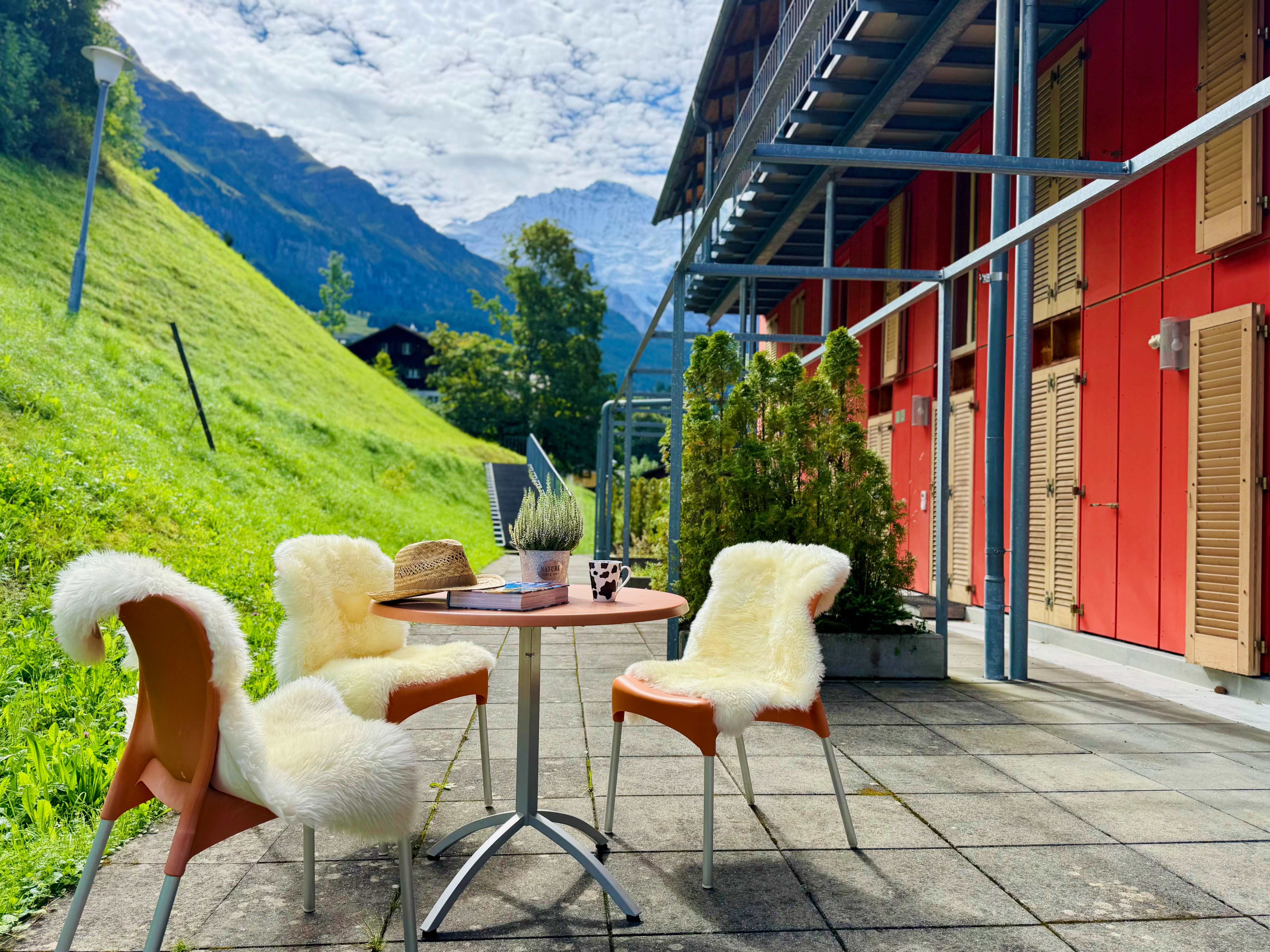 Large balcony with breathtaking views of the Jungfrau and Lauterbrunnen Valley, as well as a separate terrace area.